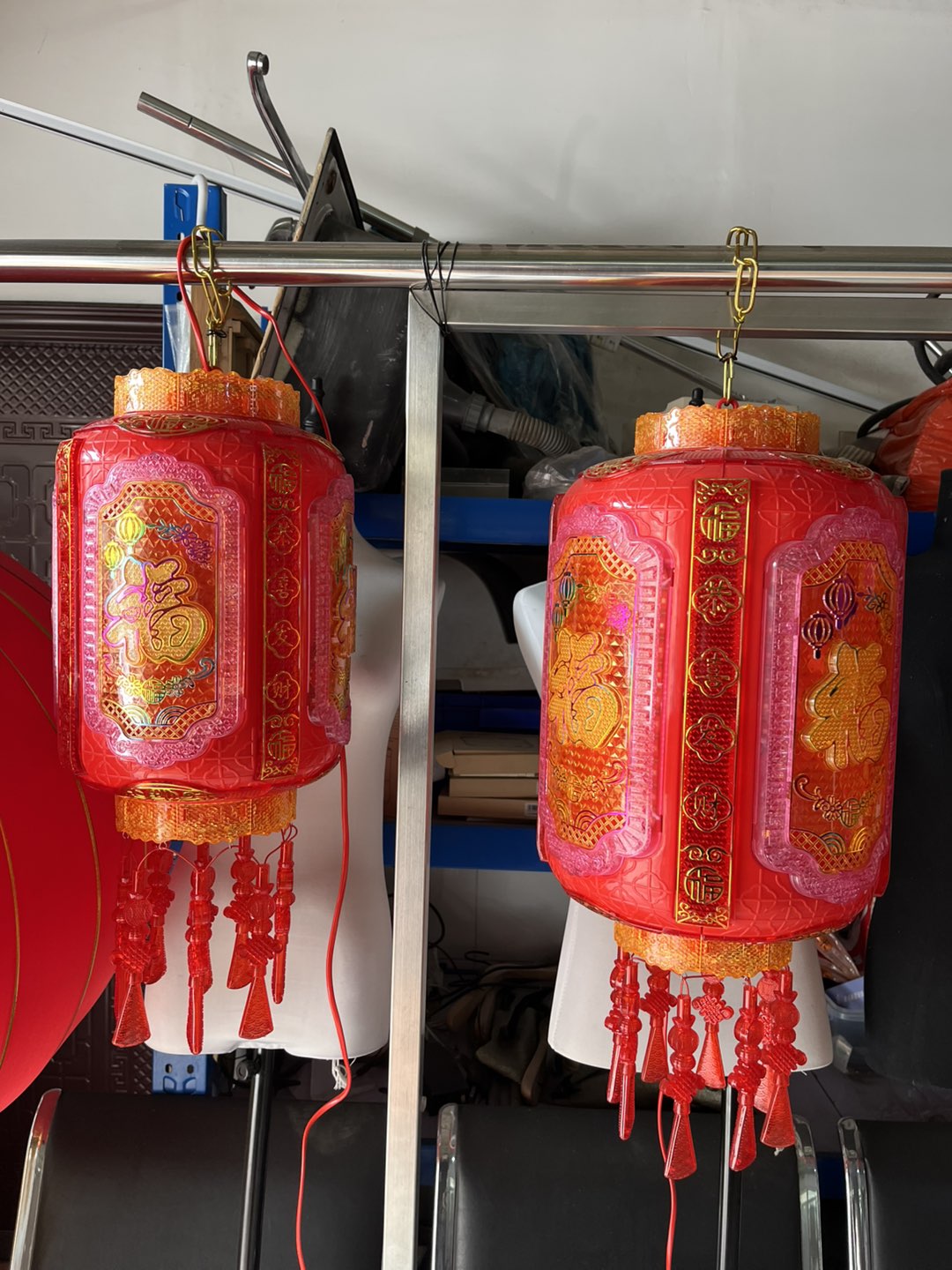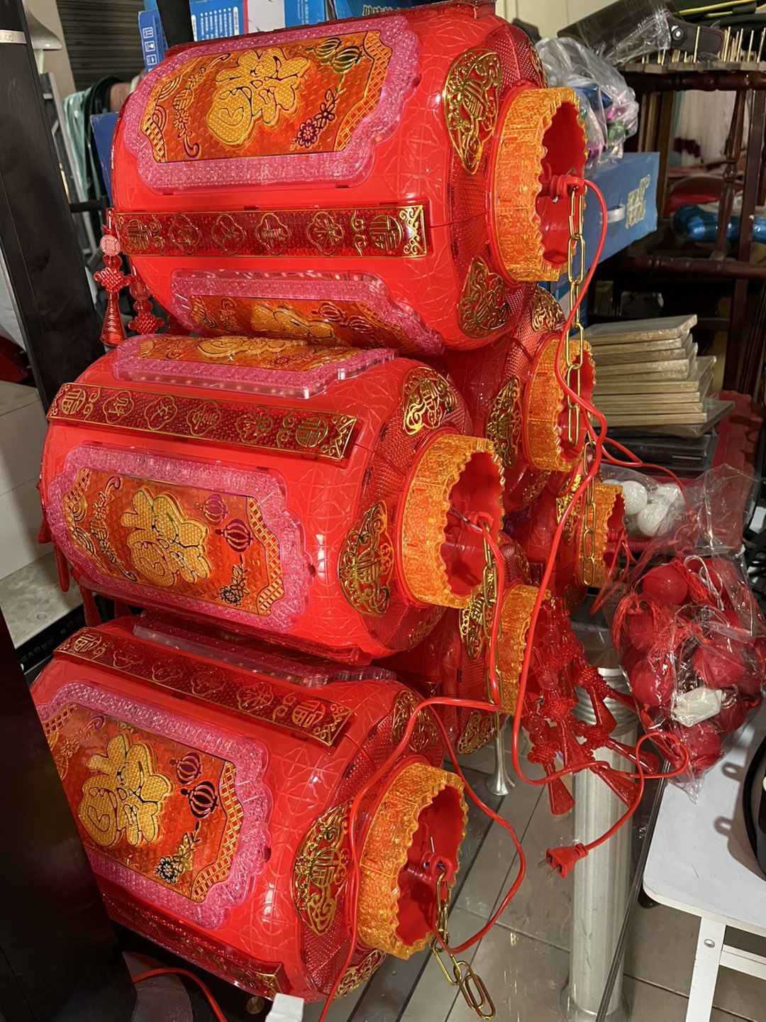 图一仅一个70,插电可旋转,图二比较多可成对,60一个,插电可旋转,图四灯笼就是图二,有两个型号,小的40,大的60,图五即图二大小一致,图六只有一个,只亮灯不旋转70,图七有两个,直径接近80厘米,80一个,带灯带旋转,图八布灯笼5元一个,还有比它大的10元15都有,图九有两个超大布灯笼,直径一米左右,适合酒店农家乐或农村房子比较大的,50一个,需要可联系,买得多可再适当优惠